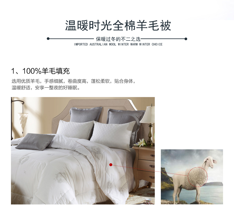 ボアウルはダブの布団にシゲルの全绵を芯にして温めます。春と秋に厚いです。绵羊毛は暖かい时に100%の羊毛が200*230 cmです。