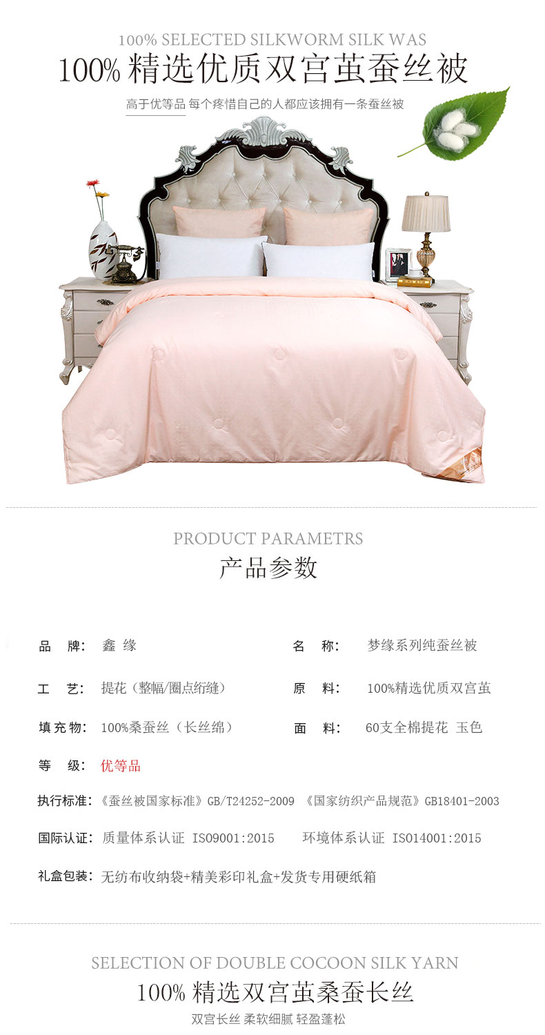 鑫縁100%桑蚕糸は夏冷に温度調節されてかけられます。布団春秋は坚绵布団で芯梦縁シリズの玉色优等品蚕糸の正味重量は2 kgで220*240 cmです。