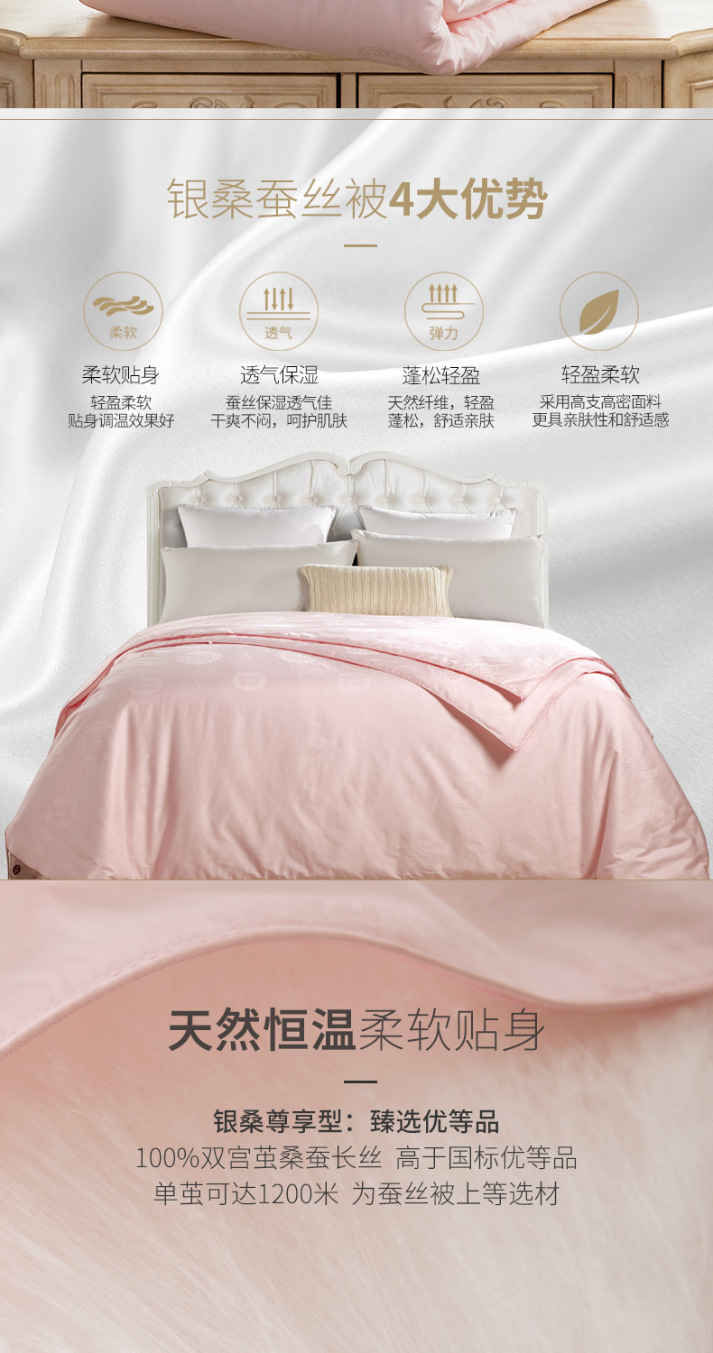銀桑蚕糸は100%桑蚕糸によって、夏は寒くて薄くて、温度調節されています。布団蝉糸布団の双宮繭長糸固形綿子カバは、芯蚕糸の正味重量1.2.5 kgのピンク伊人200*230 cmです。